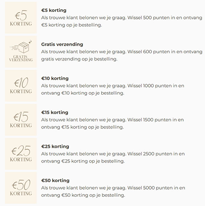 • Spaarpunten kunnen worden ingewisseld voor korting of gratis verzending.
